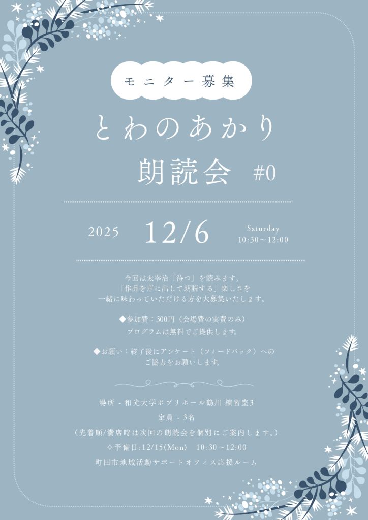 ◆ 12/6(土)10時30分~12時 @和光大学ポプリホール鶴川 練習室3 「とわのあかり朗読会#0」