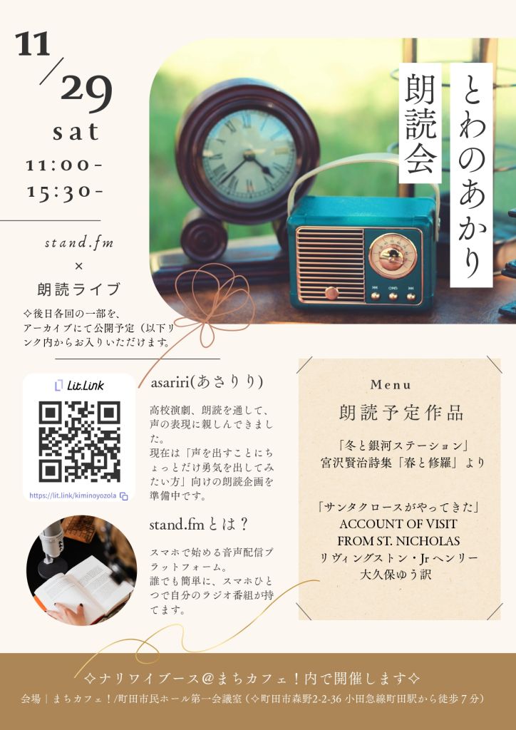 ◆ 11/29 とわのあかり朗読会 stand FM 配信 11時00分~/15時30分~